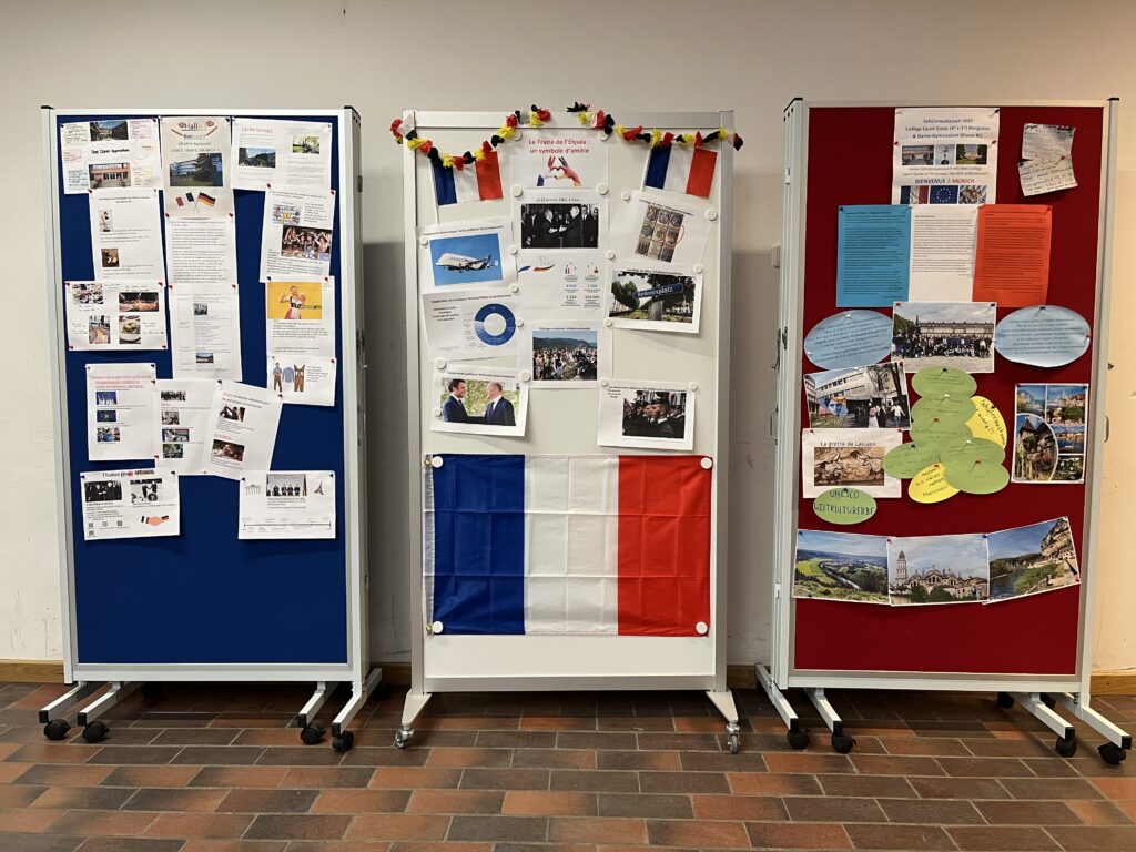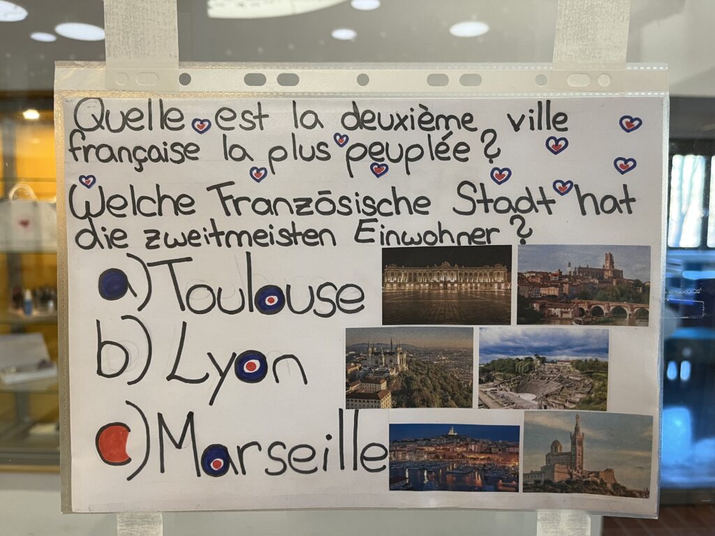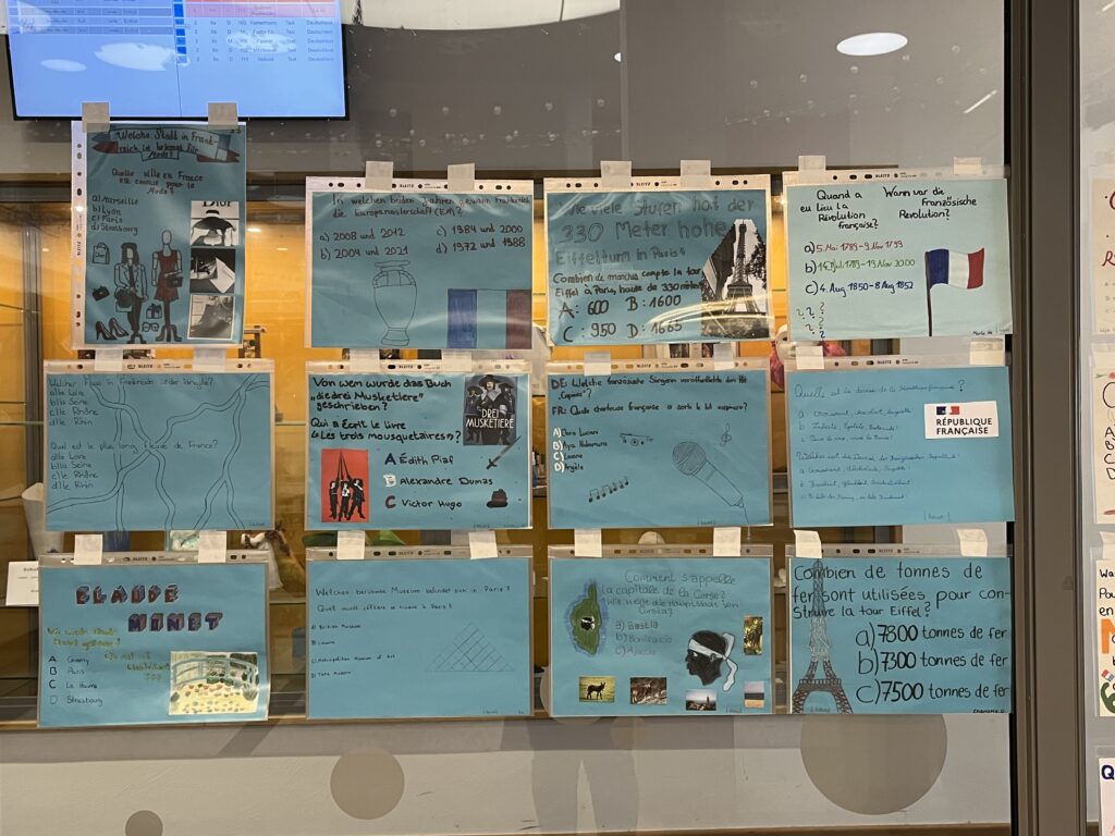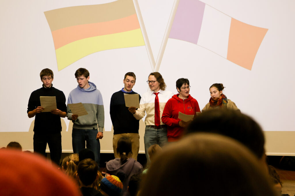 Wie jedes Jahr am 22. Januar feierte das Dante-Gymnasium auch heuer wieder den Deutsch-Französischen Tag und damit die Freundschaft, die mit dem Élysée-Vertrag von 1963 ihren Anfang nahm. Schülerinnen und Schüler verschiedener Jahrgangsstufen gestalteten abwechslungsreiche Projekte, um in den beiden Pausen die gesamte Schulgemeinschaft einzubeziehen. Dabei durften wie immer die liebevoll vorbereiteten Aushänge mit Quizaufgaben über Frankreich, das bewährte deutsch-französische Diaporama und die informativen Ausstellungen über die Geschichte des Élysée-Vertrags und über die letztjährigen Frankreichaustausche nicht fehlen. Schülerinnen und Schüler der Q12 und der Q13 sorgten mit dem Verkauf von Crêpes und anderer französischer Leckereien wieder für das leibliche Wohl. Besonders viel Applaus gab es dieses Mal in der zweiten Pause für den musikalischen Auftritt einer Gruppe frankophiler Oberstufenschüler und Lehrer, die mit zwei französischen Liedern begeisterten. Bravo et merci beaucoup!
