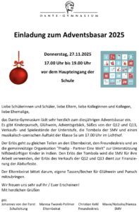 « Alle Veranstaltungen Diese Veranstaltung hat bereits stattgefunden. Adventsbasar 27. November @ 17:00 - 19:00 « Buß- und Bettag (unterrichtsfrei) Elternabend Digitale Schule der Zukunft (Jgst. 9) » Zum Kalender hinzufügen Google Kalender iCalendar Outlook 365 Outlook Live Details Datum: 27. November Zeit: 17:00 - 19:00