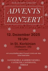 « Alle Veranstaltungen Adventskonzert (in St. Korbinian) 12. Dezember @ 19:00 - 21:00 « Elternabend Digitale Schule der Zukunft (Jgst. 9) Wintersportwoche (7. Jgst.) » Zum Kalender hinzufügen Google Kalender iCalendar Outlook 365 Outlook Live Details Datum: 12. Dezember Zeit: 19:00 - 21:00