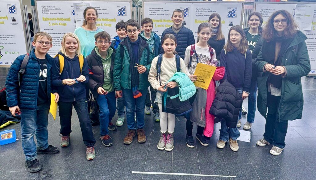 Am Samstag, den 22. Februar 2025, besuchten 13 mathematikbegeisterte Schülerinnen und Schüler der Jahrgangsstufen 5 bis 9 vom Dante-Gymnasium zusammen mit ihren Mathematiklehrkräften Frau Biele und Frau Kunzmann den „Tag der Mathematik“ an der TU München. Nach einer kurzen Begrüßung in einem der großen Hörsäle stellten sich die Teilnehmer in Teams verschiedenen Aufgaben, die im Rahmen eines Wettbewerbs zu lösen waren. Je mehr Aufgaben richtig beantwortet wurden, desto mehr Lose mit dem Teamnamen wanderten in den Lostopf. Nach der Mittagspause hatten alle die Möglichkeit, entweder einen von zwei spannenden Vorträgen zu besuchen oder an einem von sechs Workshops teilzunehmen. Ein Höhepunkt des Besuchs der TU-Mathematikfakultät in Garching war natürlich das Rutschen der berühmten Parabelrutsche. Nach der mitreißenden Siegerehrung trat die Gruppe den Heimweg an.