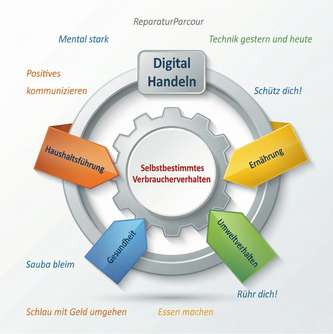 Aus den vom KM vorgegebenen Handlungsfeldern Gesundheit, Ernährung, Haushaltsführung, Selbstbestimmtes Verbraucherverhalten, Umweltverhaltenund Digital handelnwurde das HandlungsfeldSelbstbestimmtes Verbraucherverhaltenals Leitthema gewählt, da es bei genauerer Betrachtung die anderen Handlungsfelder beinhaltet. Erfreulicherweise konnte deswegen auch eine Verknüpfung mit allen anderen Handlungsfeldern im vorliegenden Konzept verwirklicht werden. Das Handlungsfeld Digital handeln wird sich, wie vom KM gefordert, in jeder der für die Projektwoche geplanten Aktivitäten und Workshops wiederfinden, was somit eine weitere Verknüpfungsebene darstellt.